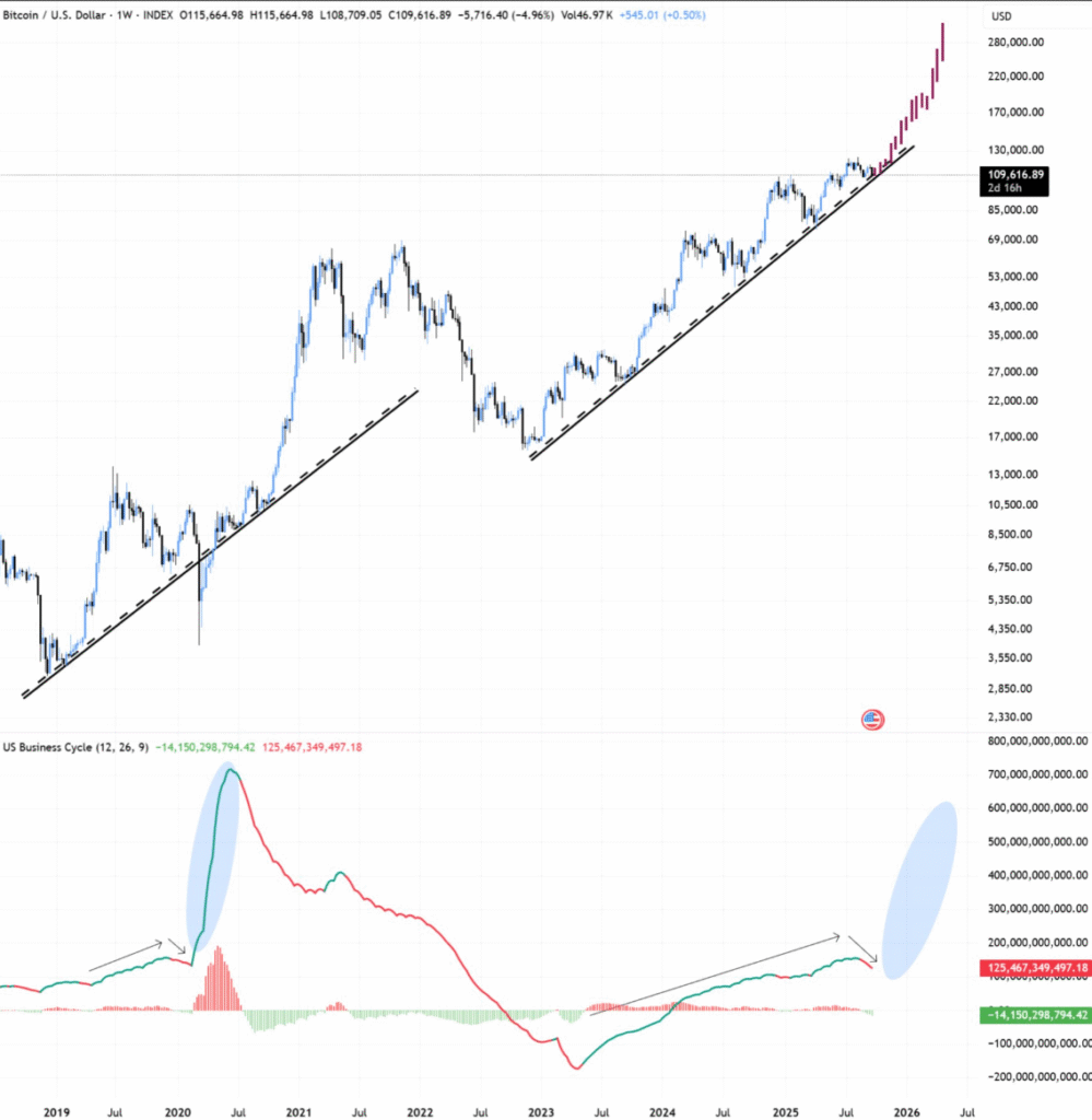 Analyst Bitbull notes that Bitcoin (BTC) remains far from a true market cycle top, highlighting that the US Business Cycle, a key measure of economic momentum, has yet to peak—an event that typically precedes major market downturns.