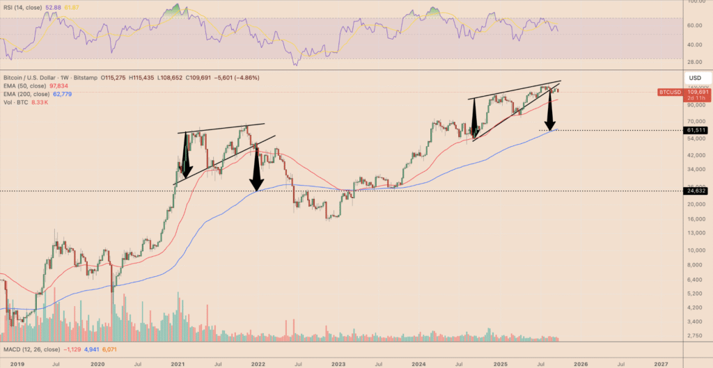 On the weekly chart, Bitcoin has also broken below a rising wedge, a bearish formation defined by higher highs and higher lows within narrowing trendlines, suggesting potential further downside.