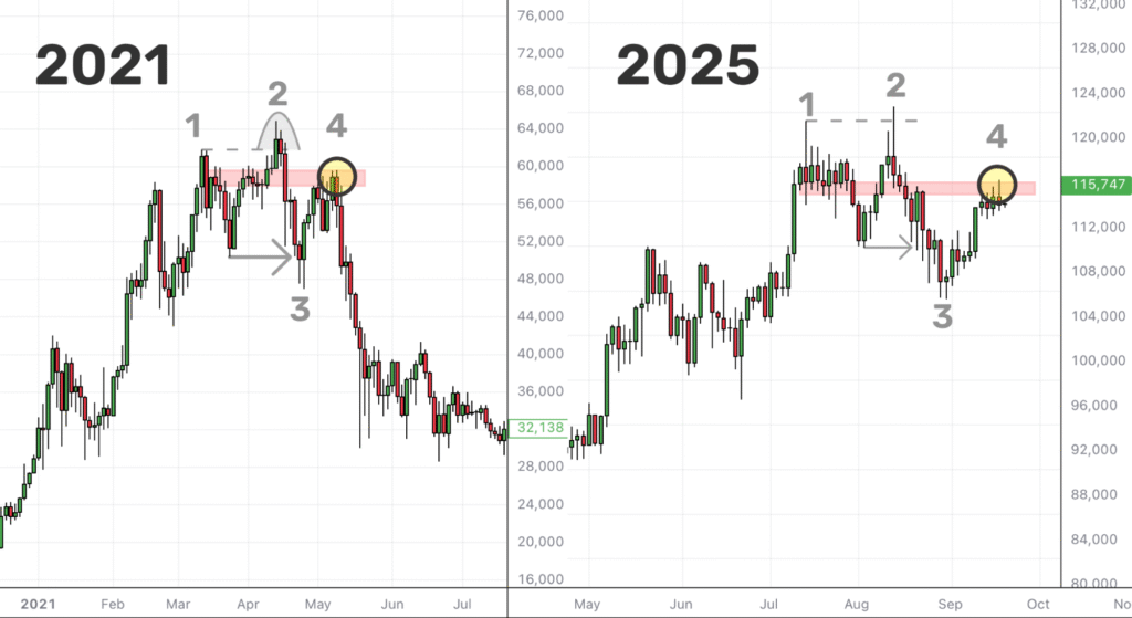 Bitcoin (BTC) in 2025 appears to be following a similar four-step pattern seen during the 2021 market peak, hovering just below a distribution zone that previously signaled a bearish reversal.